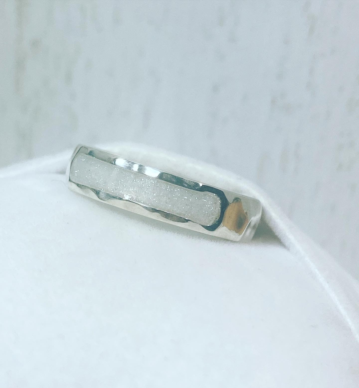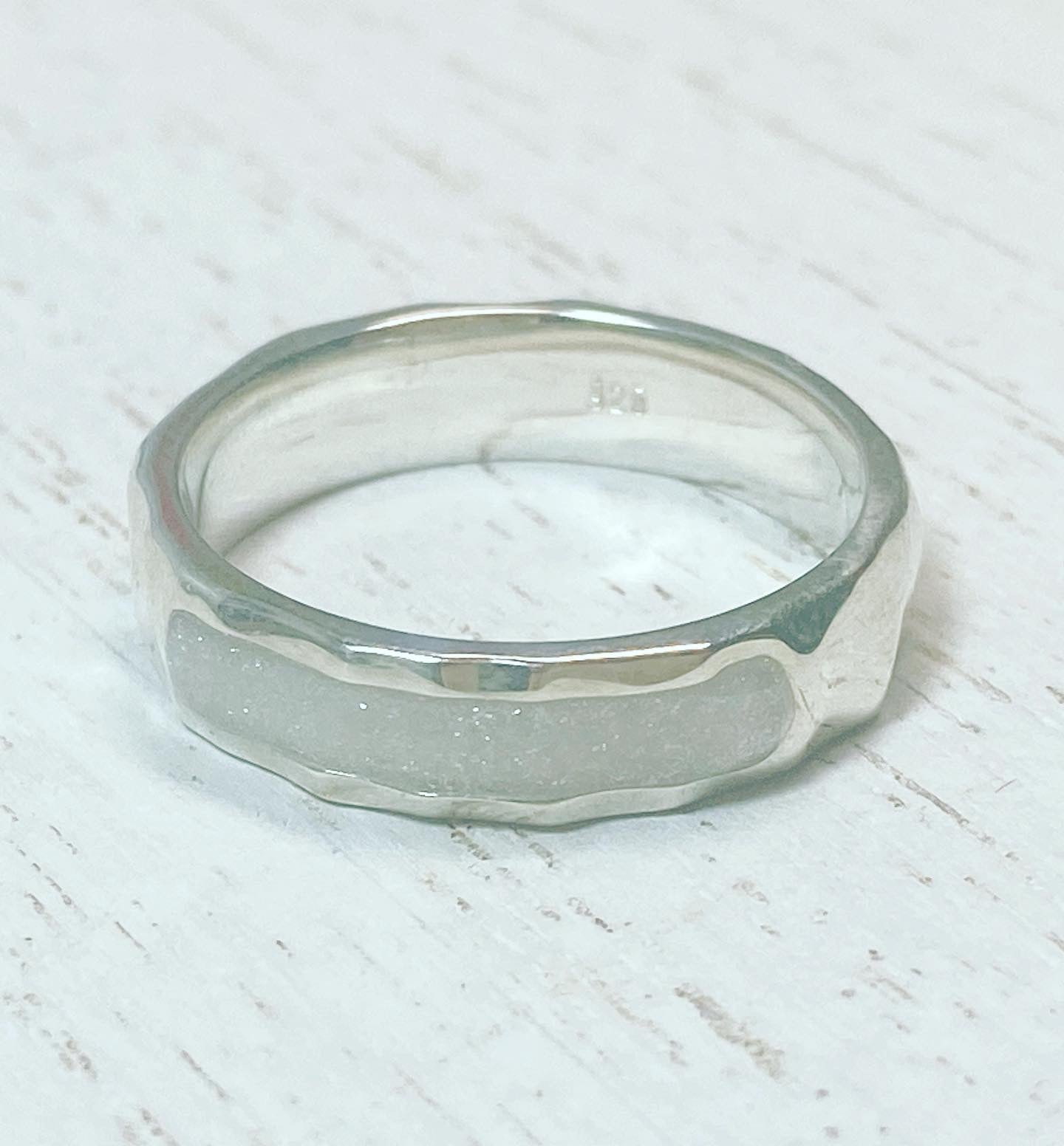 Silver .925 ring, "Hammered" style; Breatmilk stone on the outer ring; Breatmilk stone in Shimmer Dust.
