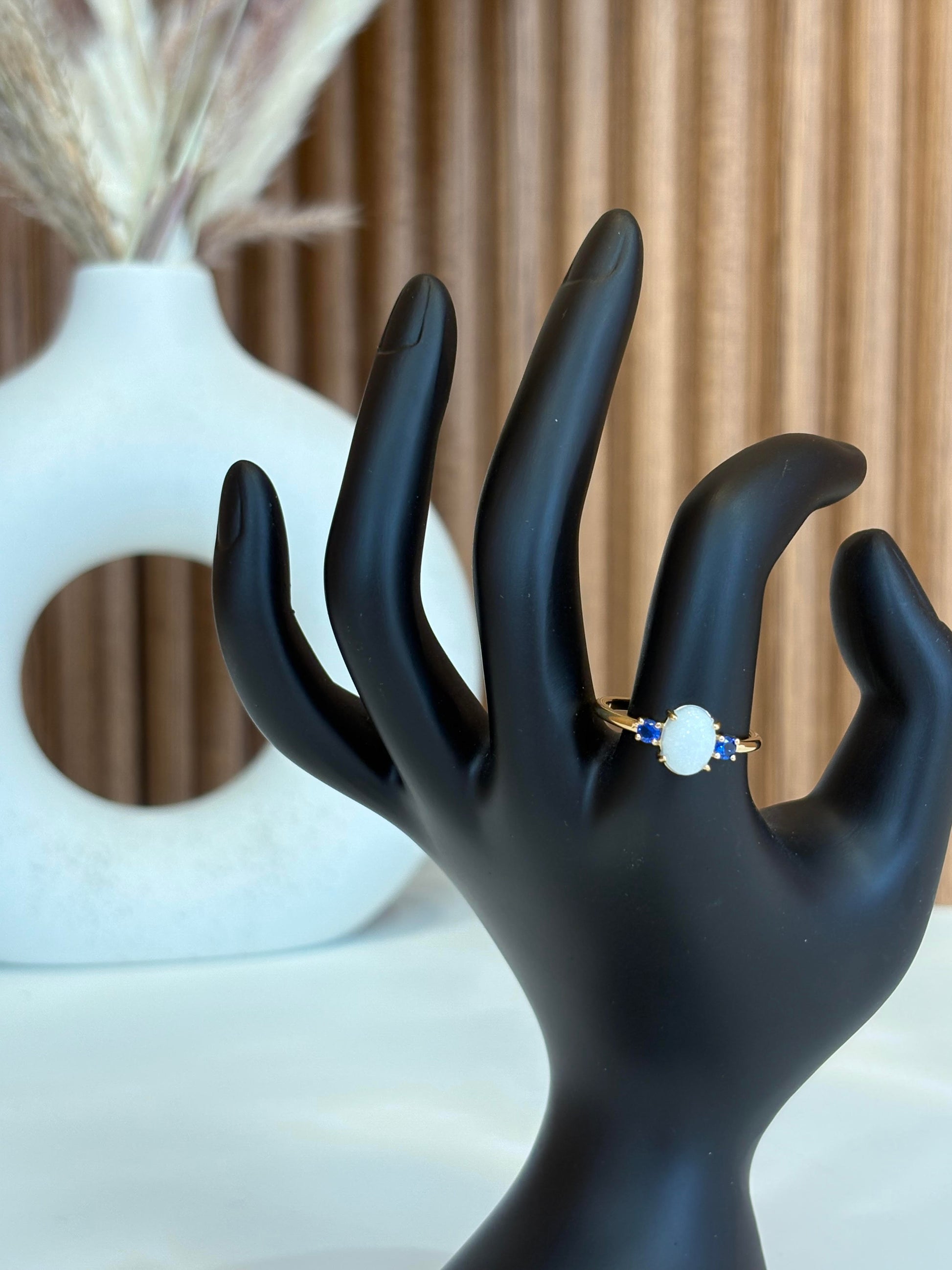 Notre bague Gemini est la parfaite combinaison de pierre de lait ovale et de zircons.