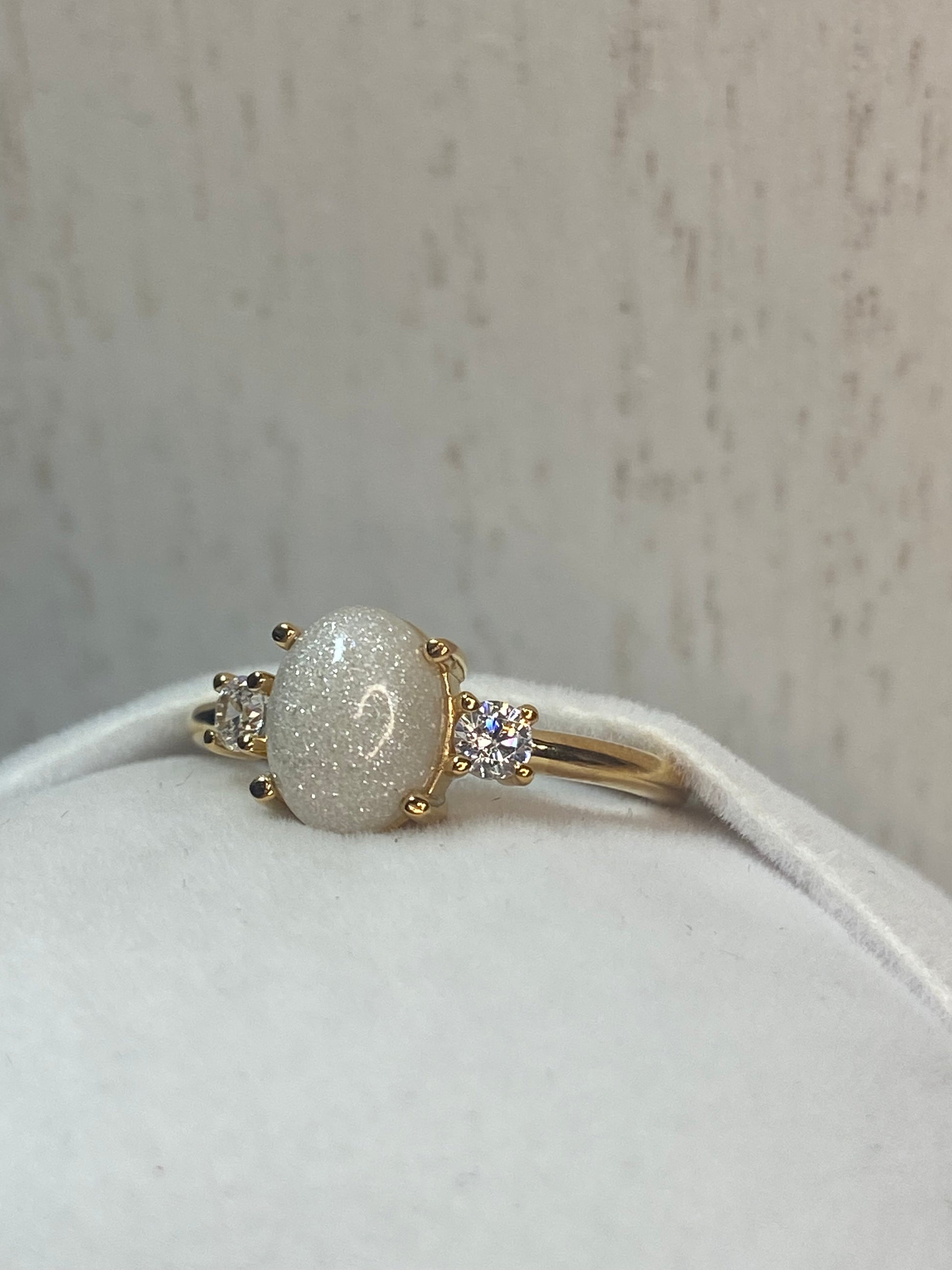 Notre bague Gemini est la parfaite combinaison de pierre de lait ovale et de zircons.