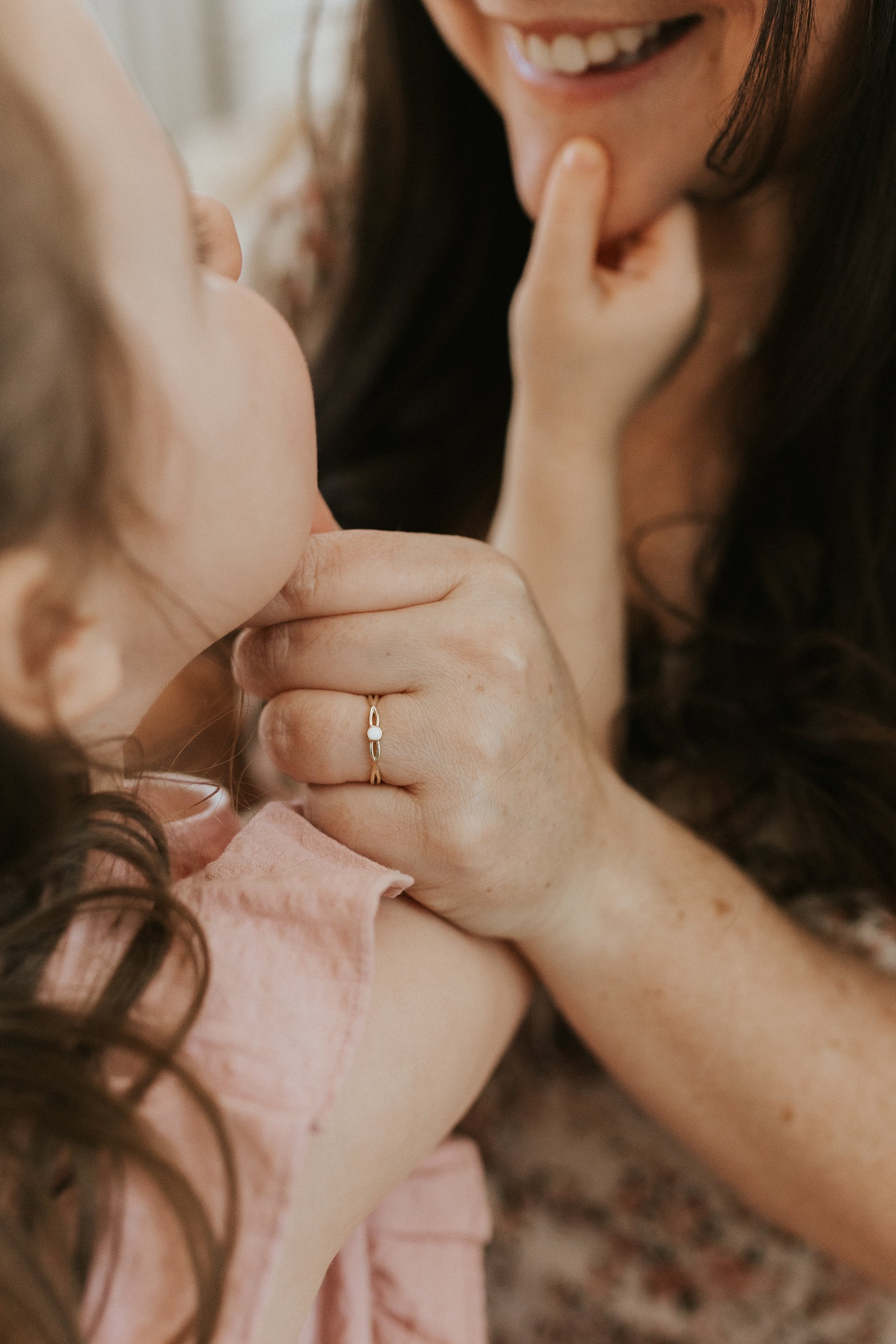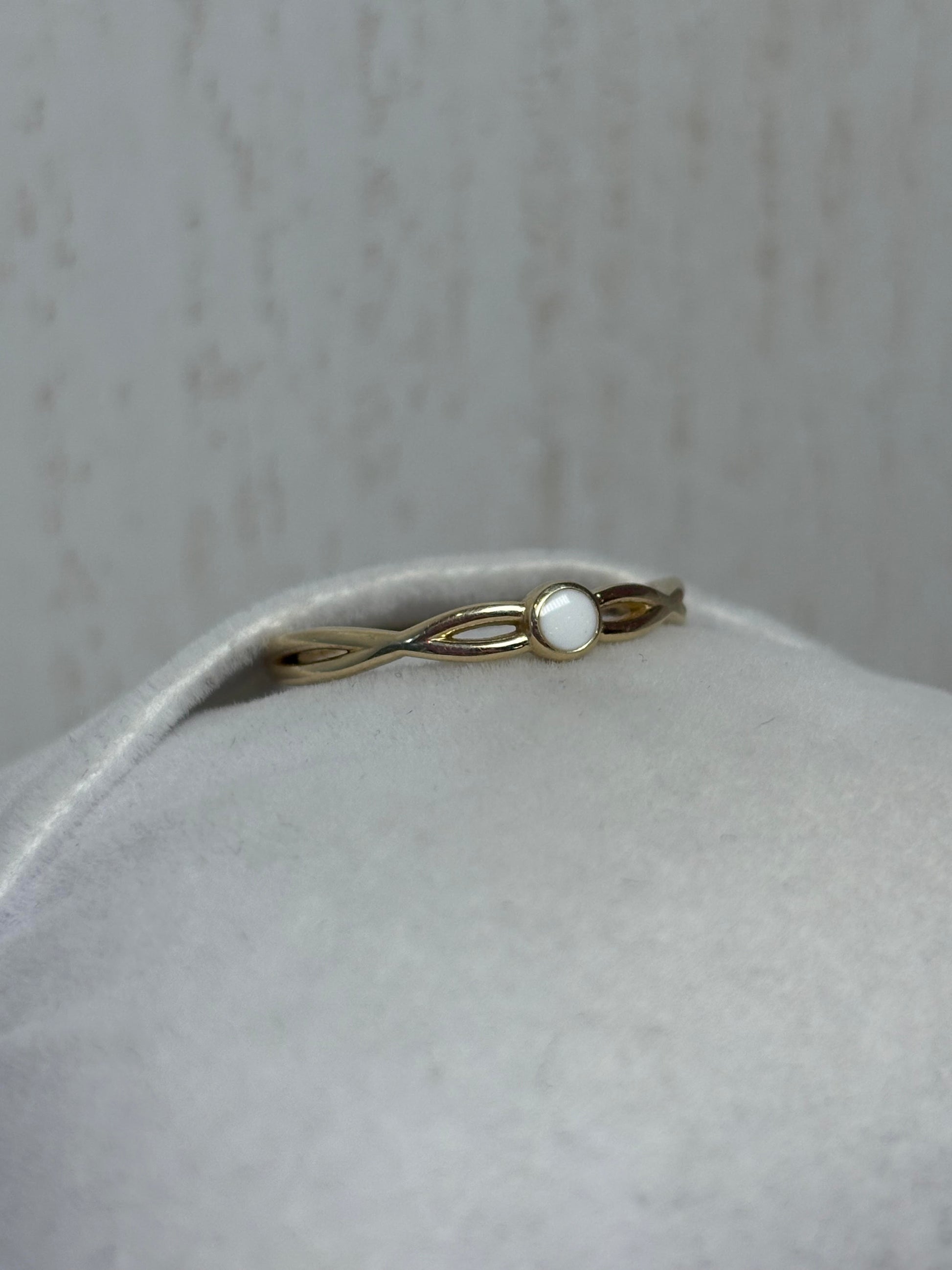 Magnifique bague délicate, avec bande entrelacée rappelant le symbole d'infini, ornée d'une petite insertion de pierre de lait maternel au centre. Cette bague tire son nom Juliette, la fille de la propriétaire et créatrice des bijoux La Voie Lactée, en plus de partager son nom avec la lune intérieure de la planète Uranus.