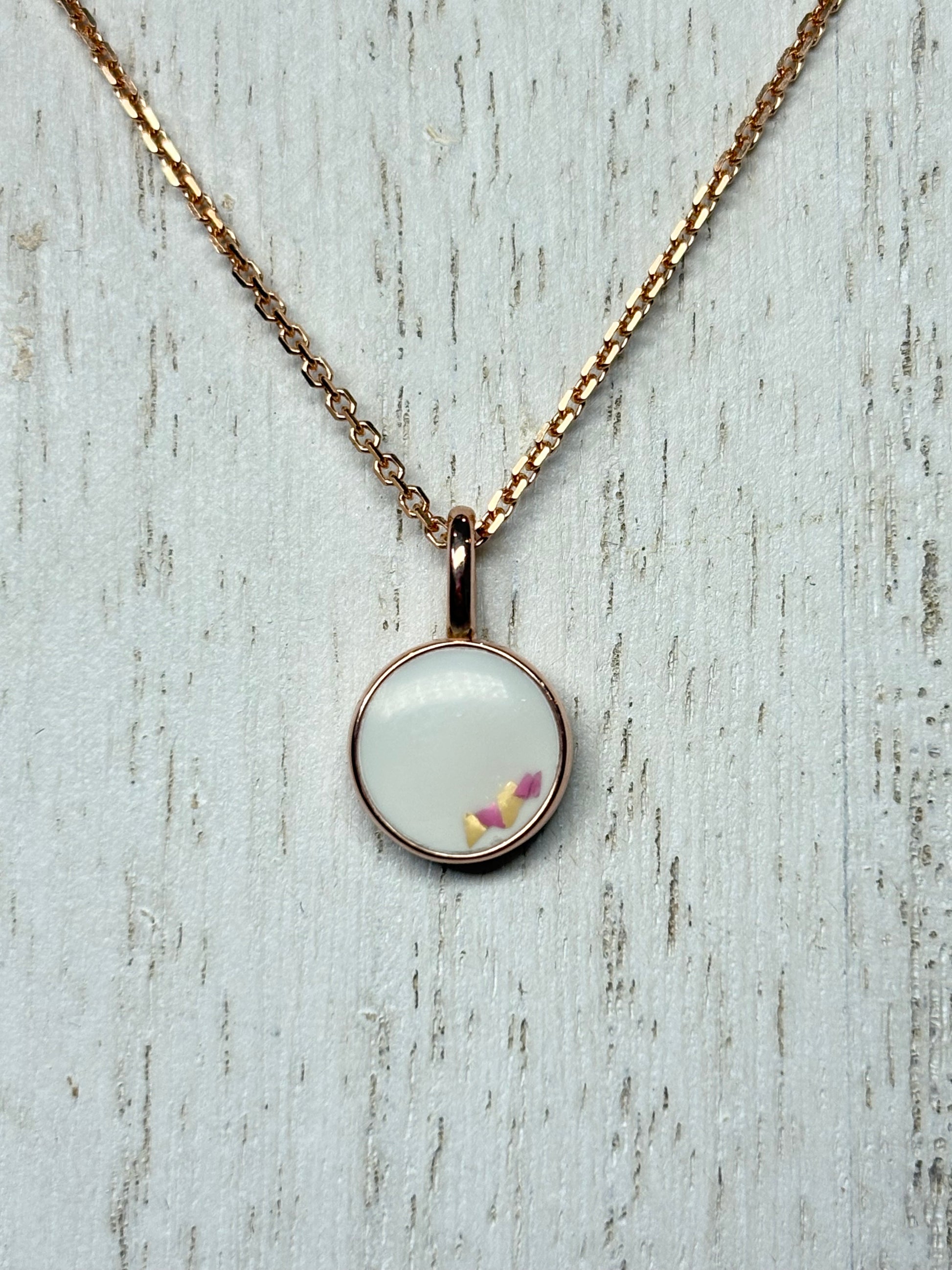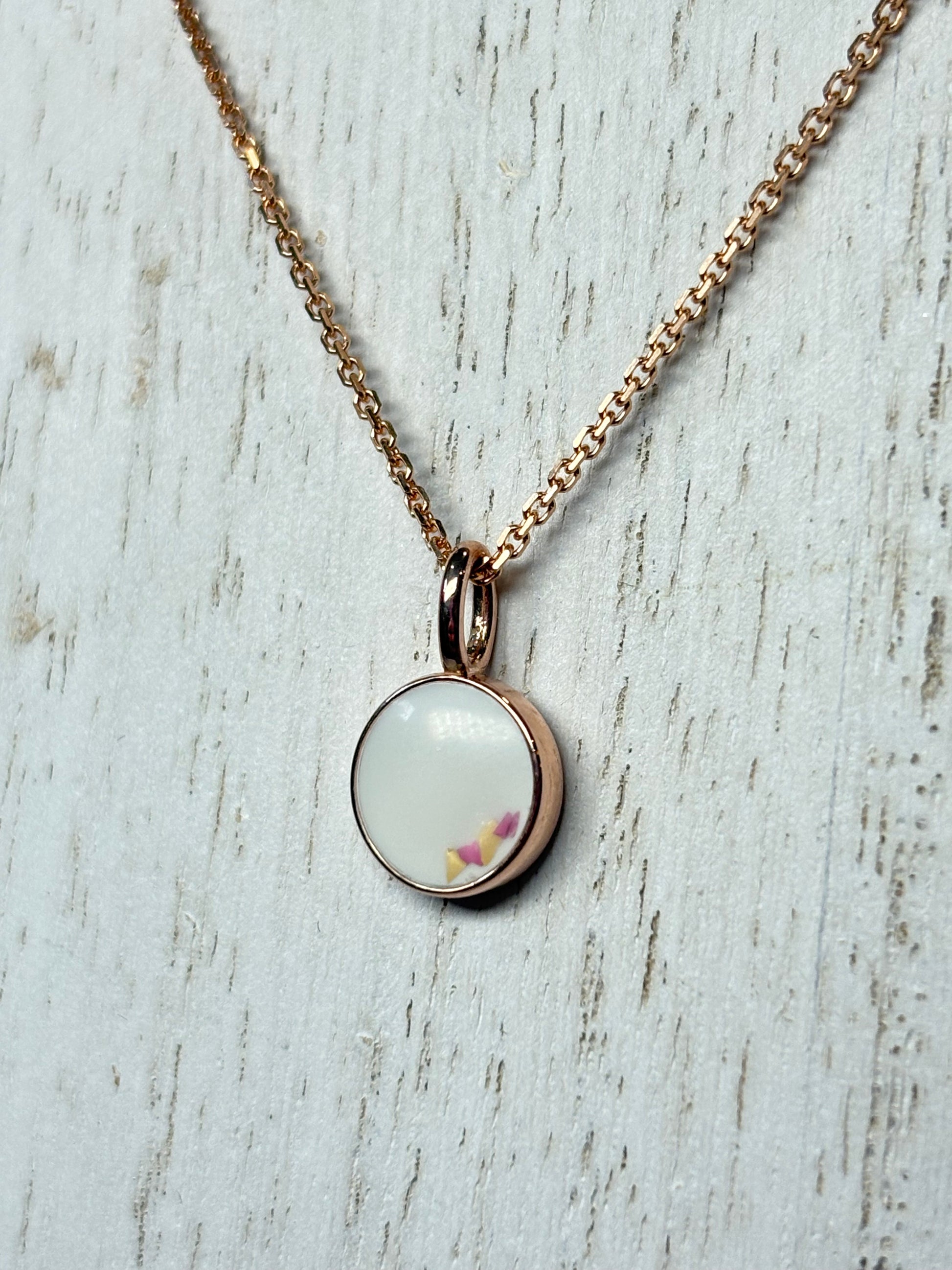 Pendant en Or Rose; Lait maternel Fini "Scintillant" avec insertion de fleurs séchées; lait teinté "rosé".