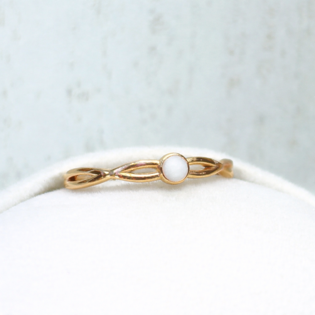 La bague Juliette: une monture fine, subtilement torsadée, qui évoque les chemins de la vie et les liens invisibles qui unissent une mère à son enfant.